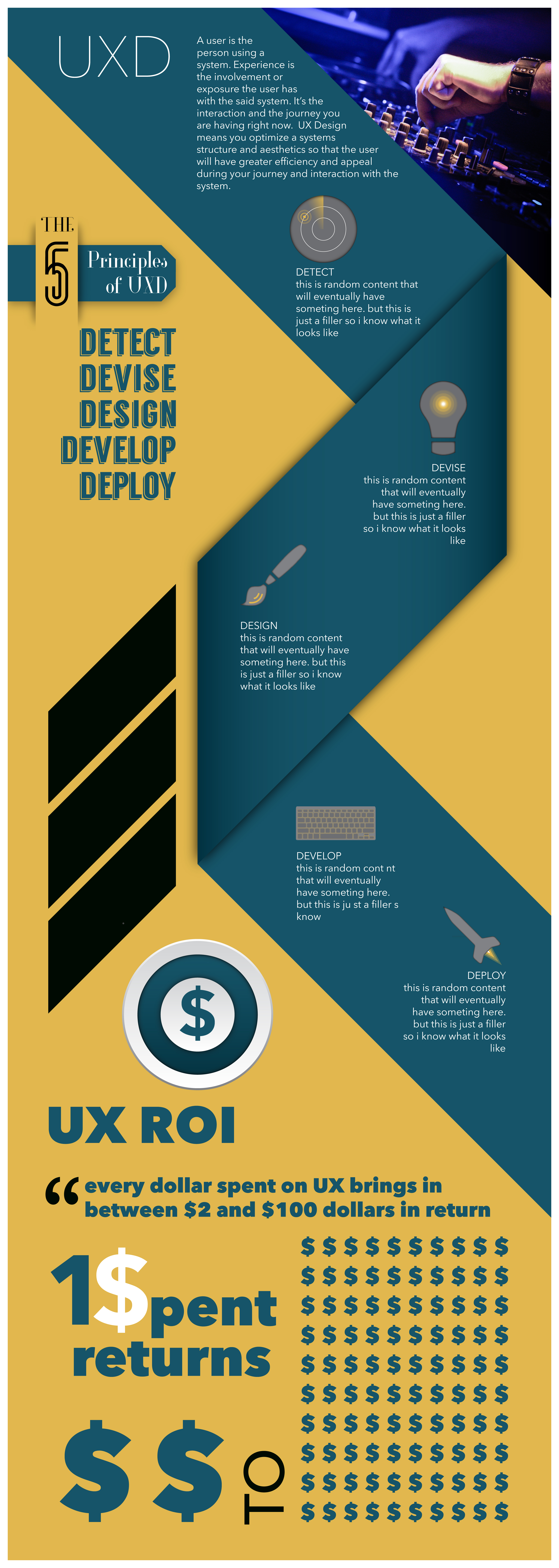 For this stage of the project, we are to refine our infographic with improved vectorized graphics and create a stylized graph or chart. I wanted to keep the graphics to compliment and be consistent with one another. So I used a philosophy of icons, but creating them in a bigger scale. I wanted to add a touch of color accents to them too, and chose to stick with the overall dominating color for it. I think it works perfect, as long as the vector graphics stay on the ribbon. I think there is a lot of refining to do however, i feel that my graph need a major change, to lure you to see the benefits of UX. I also need to work on some textual hierarchy and fix the radar so that the light source in it points downward 45 degrees, therefore leading your eyes to the next element.
